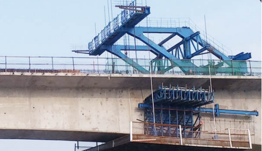 掛籃是滑動(dòng)或滾動(dòng)的承重構(gòu)架,錨固在橋梁上,含有行走軌道。在掛籃上可進(jìn)行模板、鋼筋、預(yù)應(yīng)力管道的施工,混凝土灌注和預(yù)應(yīng)力張拉,壓漿等作業(yè)。完成一個(gè)節(jié)段的循環(huán)后,掛籃即可前移并再次固定,進(jìn)行下一階段的懸澆。一直到主跨完成并且合攏;
